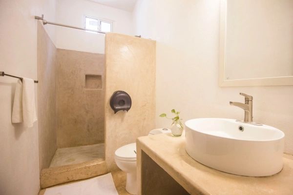 Continue down the hallway and find the first bedroom with two single beds and an exposed closet with beach towels for you to spend the day in front of the sea in the cozy beach club of chac mool. For added comfort, the room has air conditioning and ceiling fan. Next is the finely finished full bathroom, complete with shower, hand soap, shampoo and bath towels.