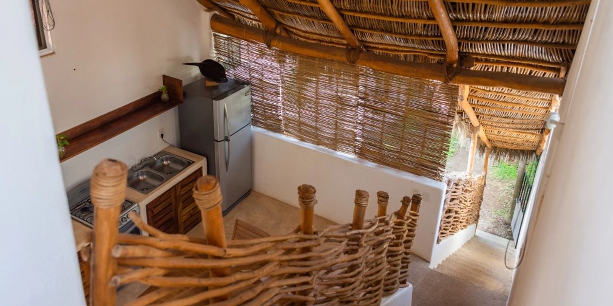 Climb the stairs and contemplate the beautiful open space with a grandiose palapa on the roof where daylight makes its way into the living room. It is in this cozy space that you will find the dining room, kitchen, refrigerator and all the utensils needed to prepare fabulous meals with family or friends.